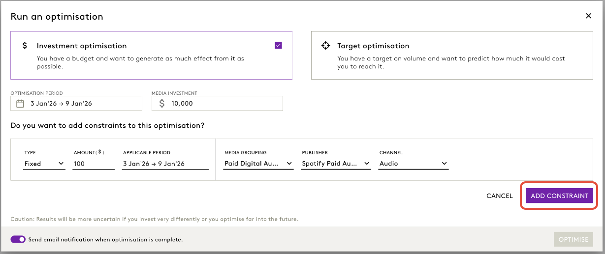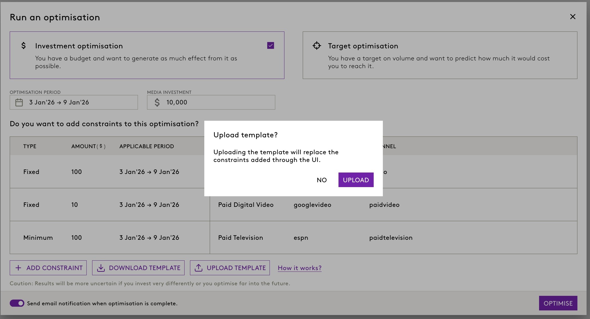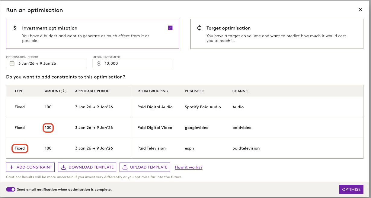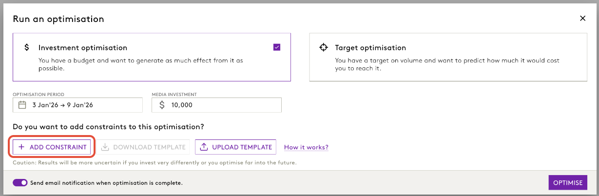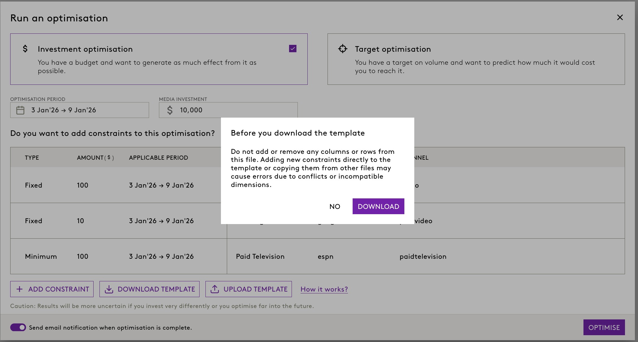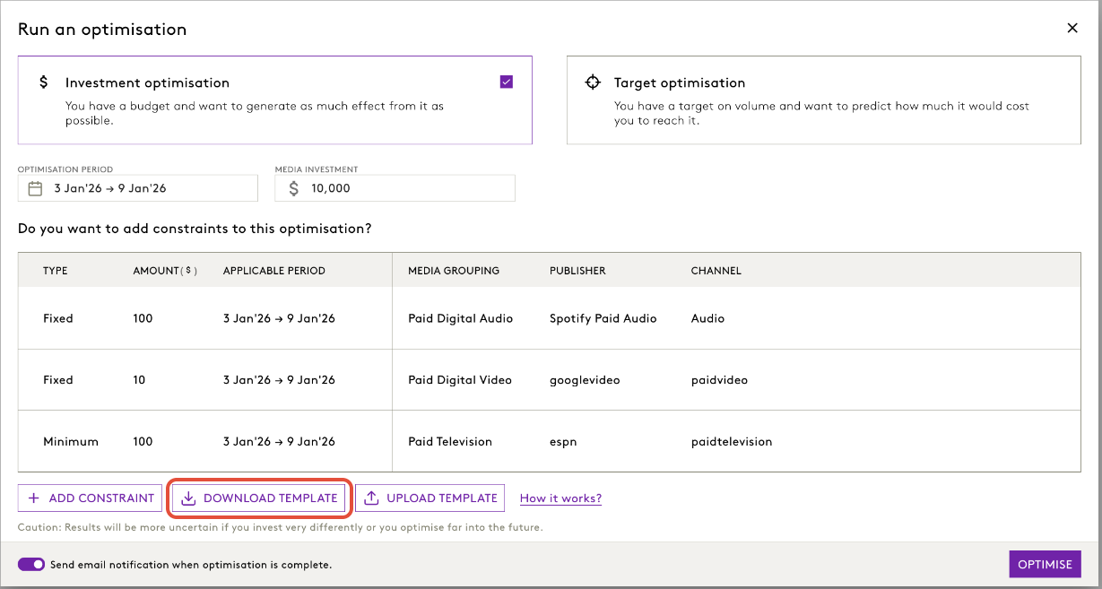Follow these steps to make the most of the Optimisation Constraint Template: