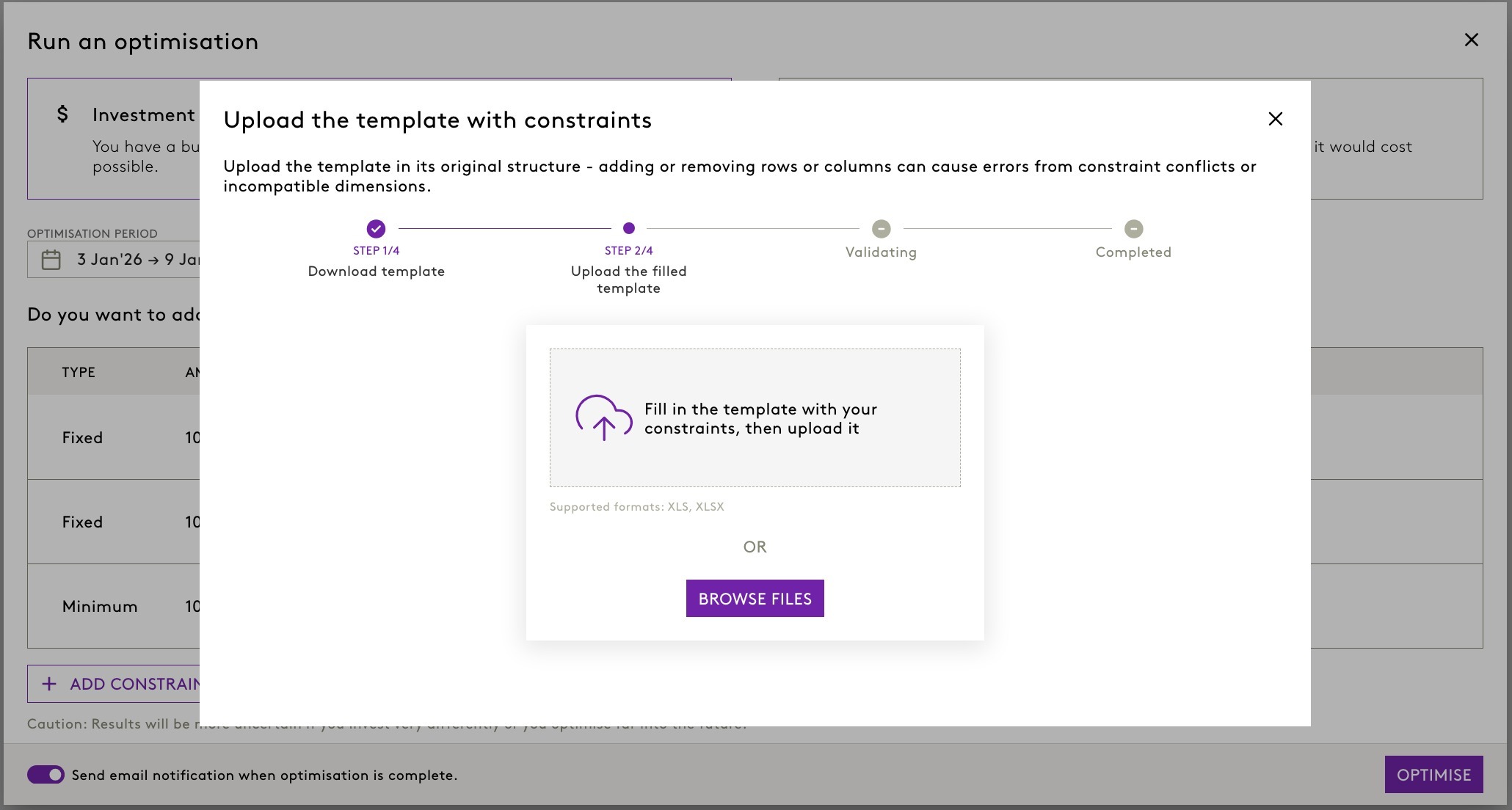 Previously, adding constraints for each optimisation run required manual entry, which was time-consuming and prone to errors. The new feature allows users to: