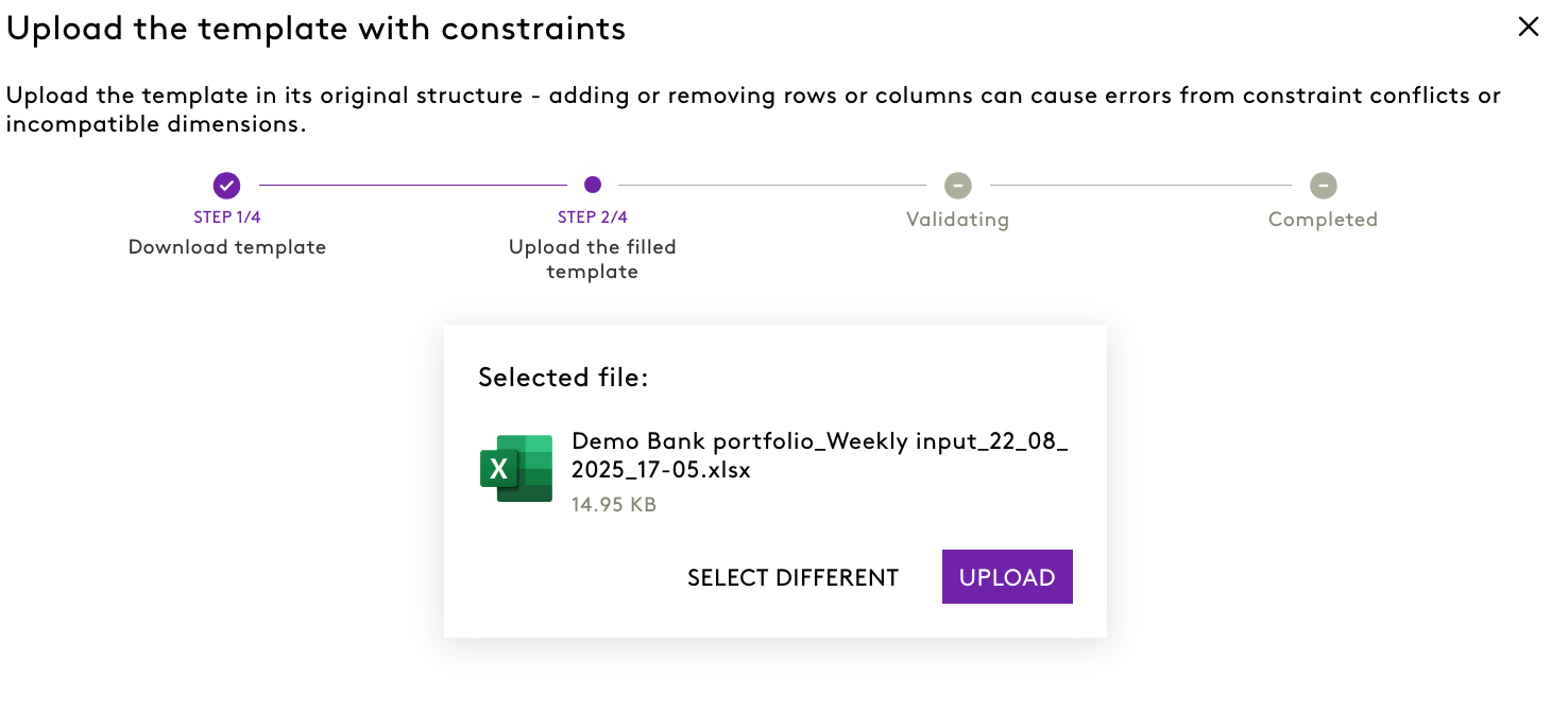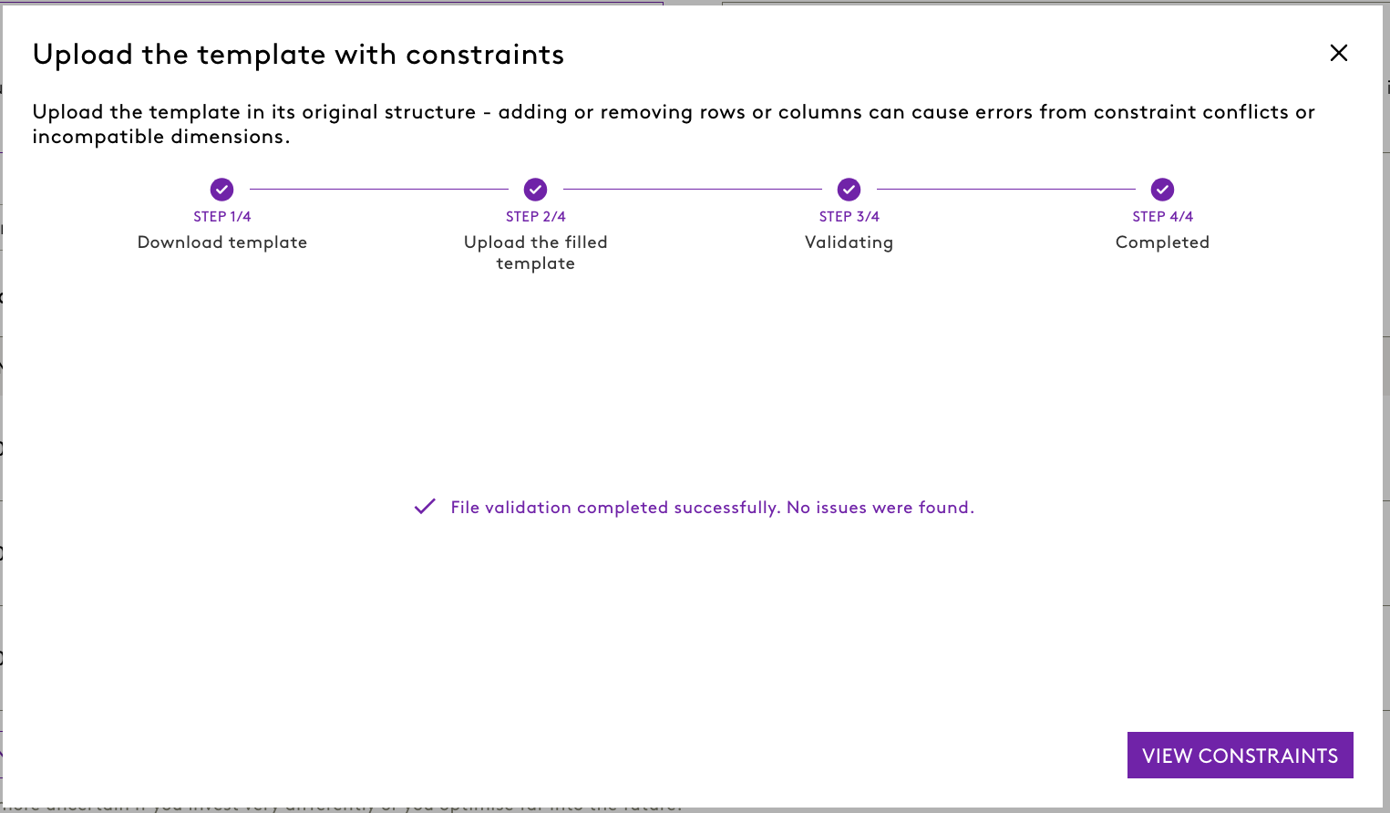 This enhancement significantly reduces manual effort and minimises errors by enabling the users to download and upload constraint templates in Excel format. With this capability, the users can reuse and share templates across scenarios, saving time and ensuring consistency in optimisation workflows.