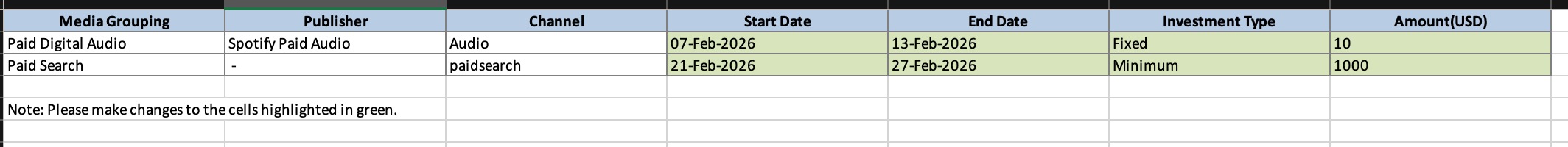 - From the new template, you can edit all the columns that are in green