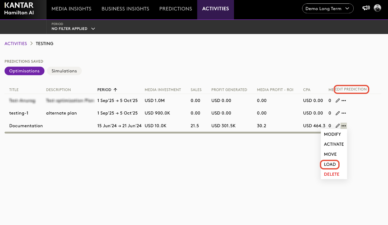 - Click on the Edit Prediction button and select the LOAD button.