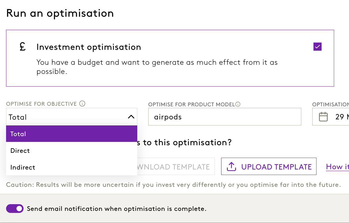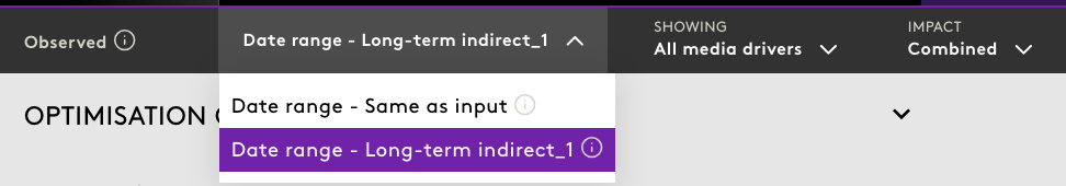 - Selecting Indirect will prioritise the indirect impact of media via brand equity-how media improves brand perception, which in turn drives sales over time.