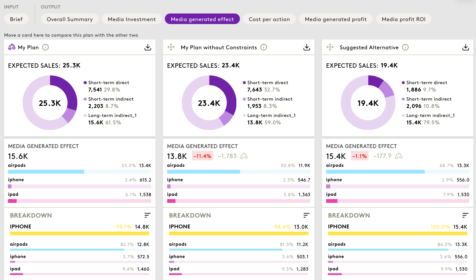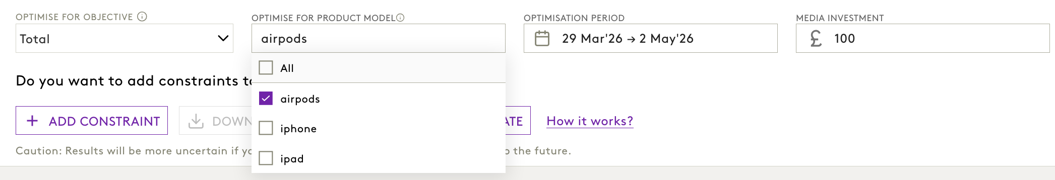 The Optimisation functionality in Portfolio Long‑Term (PLT) Models enables you to identify the most efficient way to allocate marketing investment across a portfolio of products - such as Ipads, Iphones, Macs, Aipods, and halo‑driven brand products - to maximise a chosen business objective.
