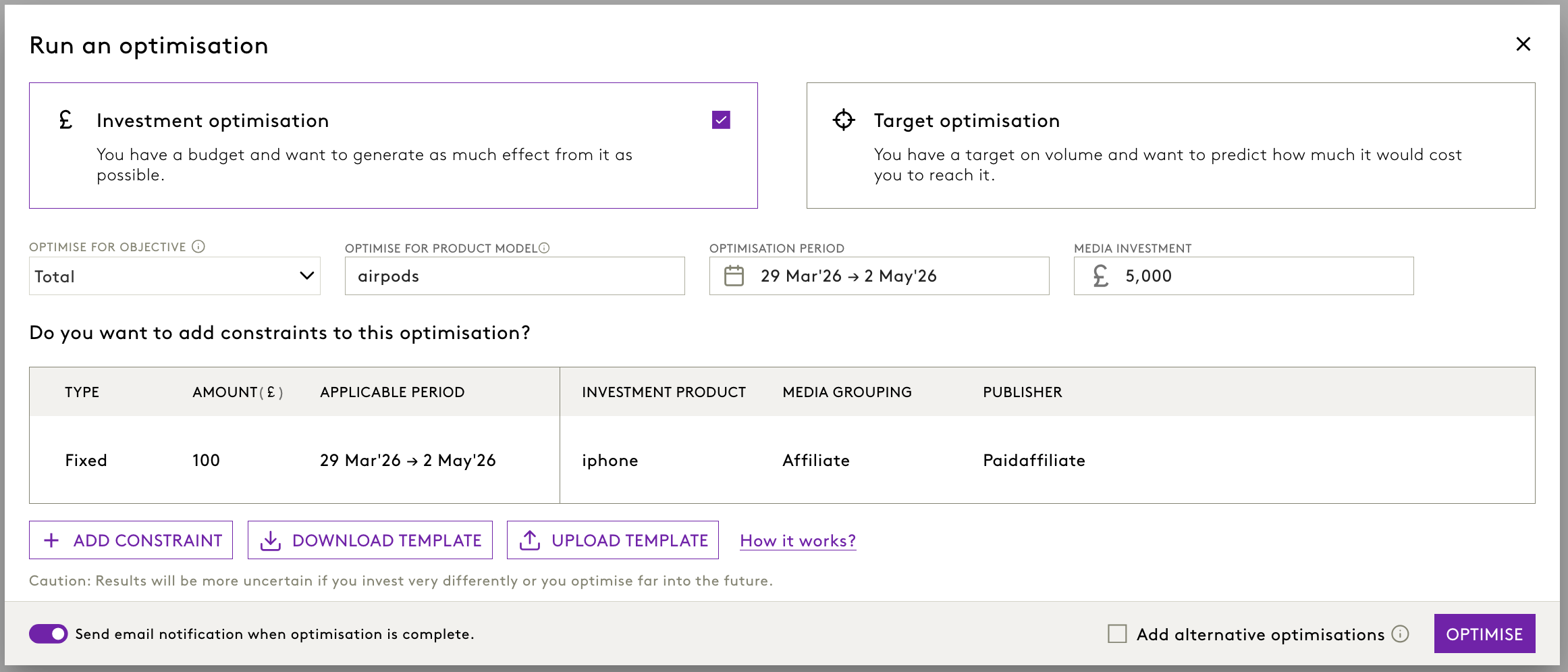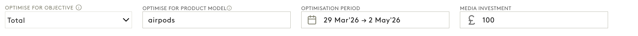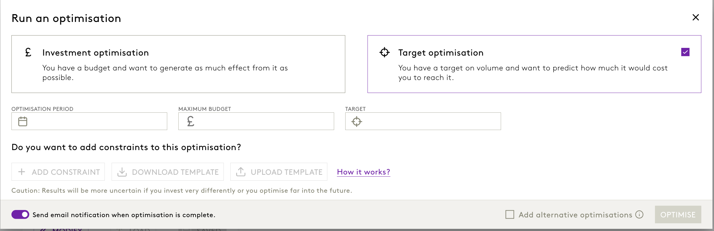 - Target Optimisation – Use when you have a target outcome (e.g. +1,000 sales) and want to estimate the required investment.