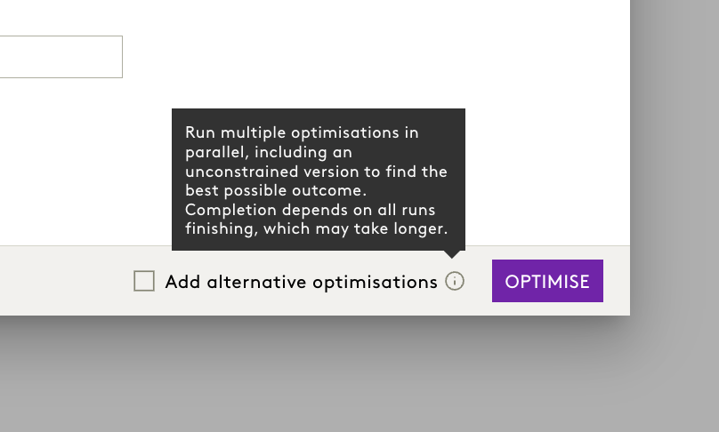 - Tick the checkbox “Add Alternative Optimisations” to run multiple scenarios in parallel.