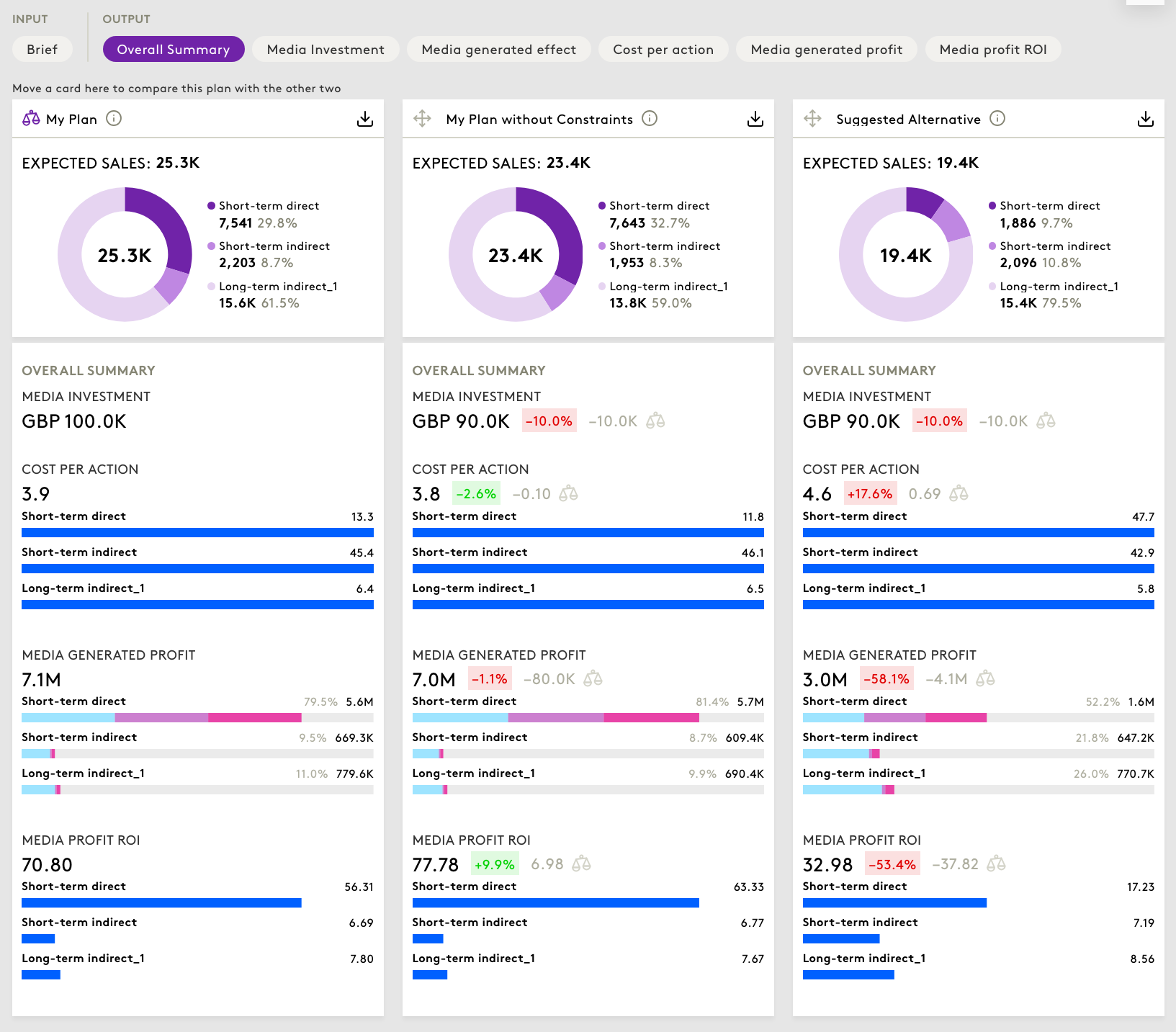 - You can analyse actual media investment, subscribers, profit, ROI, and cost per action against what the model had forecasted.