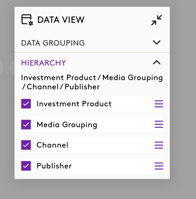 Investment Product → Media Grouping → Campaign Type → Channel → Format → Publisher