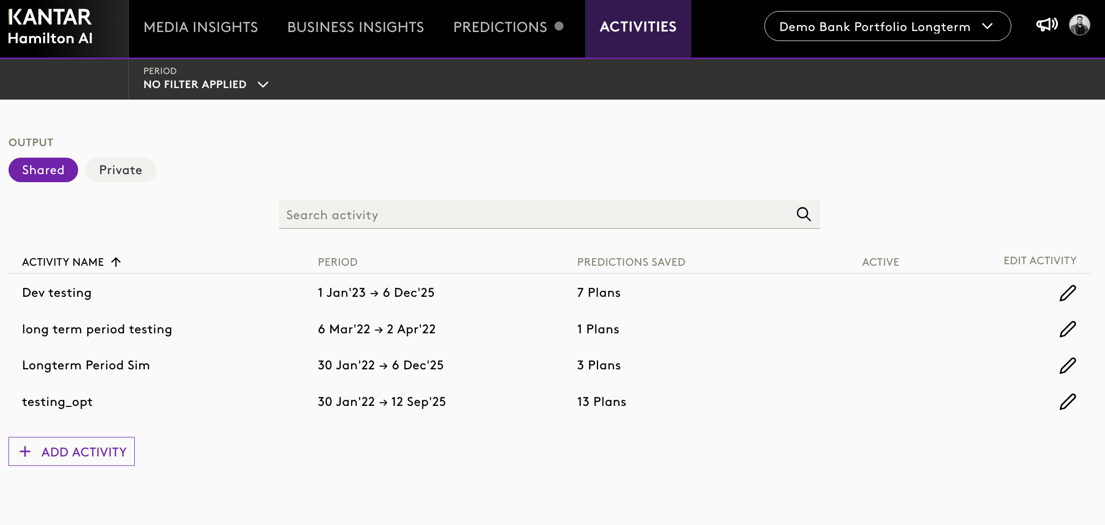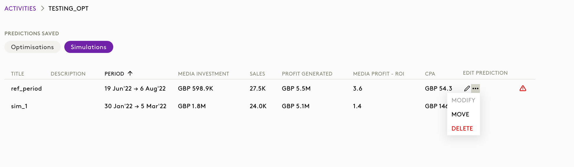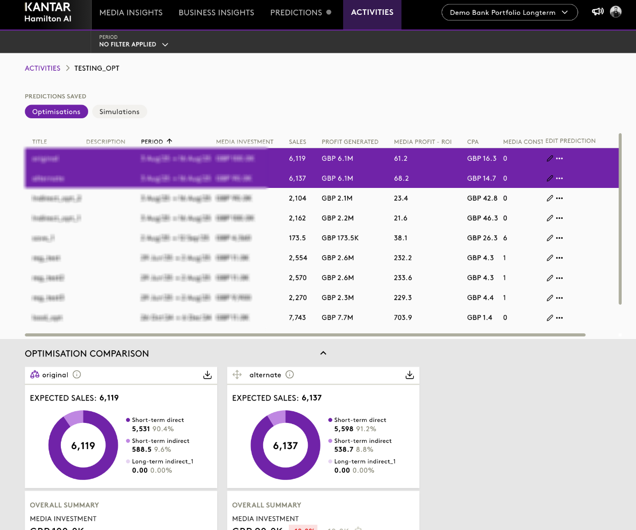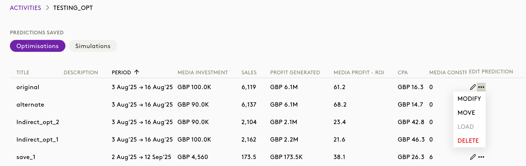 The Activities section acts as a repository for all previously run optimisations.