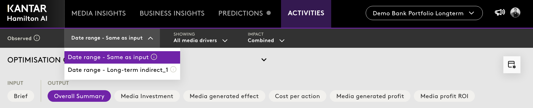 - Same as Input Date – Displays results calculated for the same time frame as the optimisation input window.